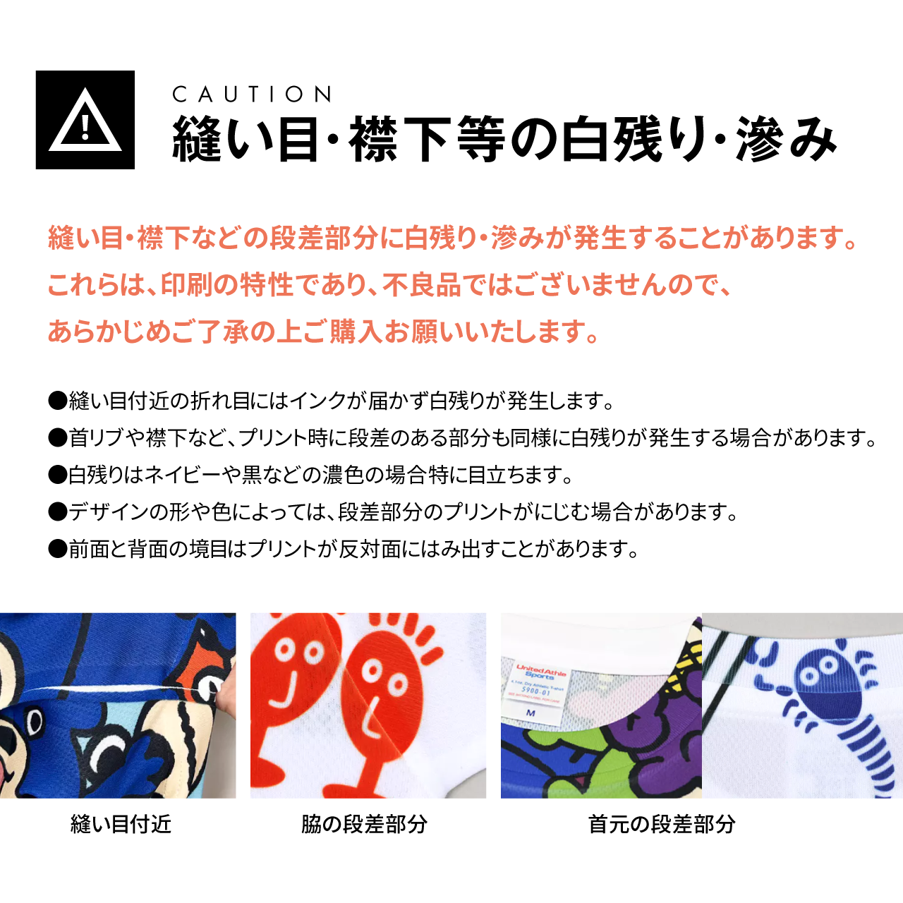 ・縫い目付近の折れ目にはインクが届かず白残りが発生します。