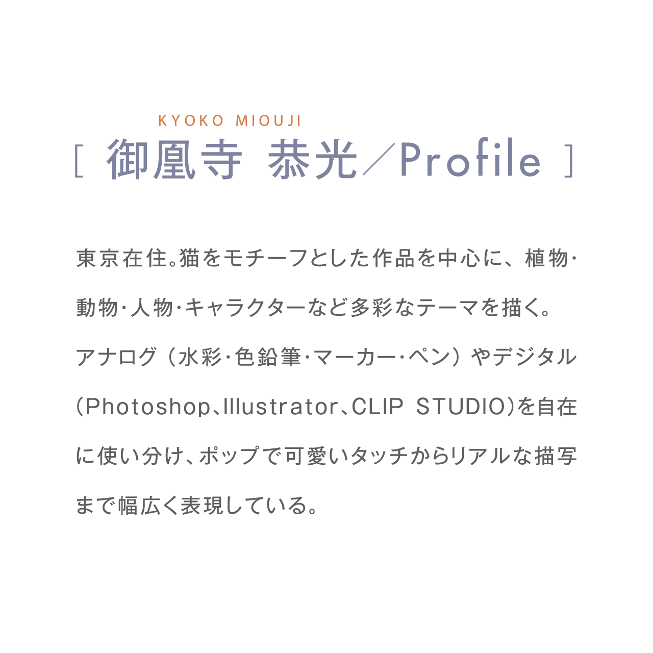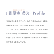 東京在住。猫をモチーフとした作品を中心に、植物・動物・人物・キャラクターなど多彩なテーマを描く。アナログ(水彩・色鉛筆・マーカー・ペン)やデジタル(Photoshop、Illustrator、CLIP STUDIO)を自在に使い分け、ポップで可愛いタッチからリアルな描写まで幅広く表現している。