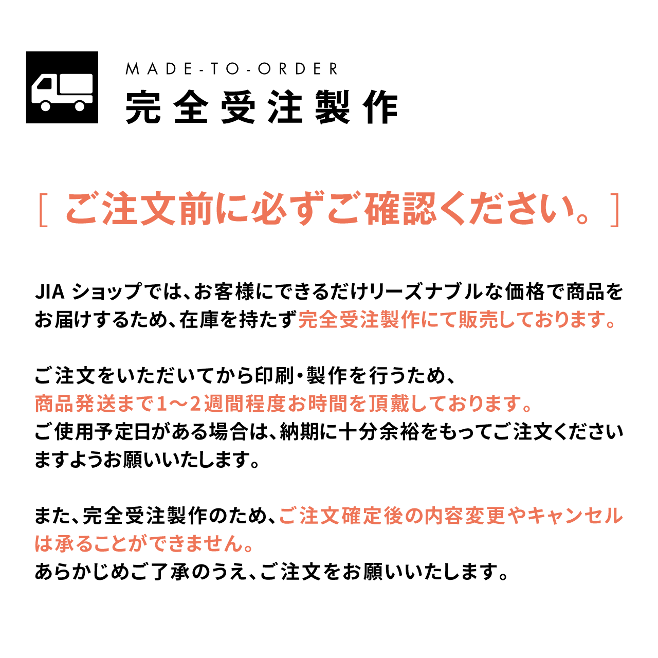 JIAショップでは、お客様にできるだけリーズナブルな価格で商品をお届けするため、在庫を持たず完全受注製作にて販売しております。